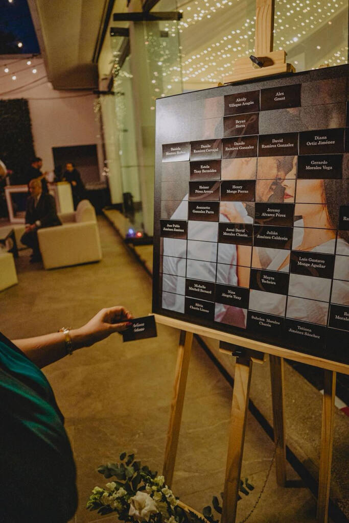 Cada cuadrito en el mosaico contiene el nombre del invitado en el frente y el número de mesa en la parte posterior, proporcionando una información elegante y funcional.